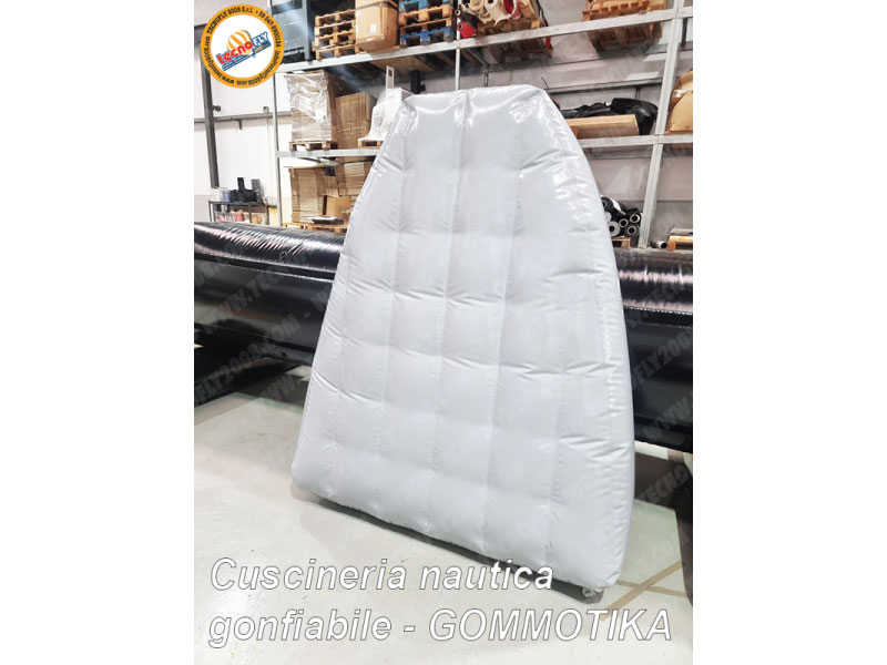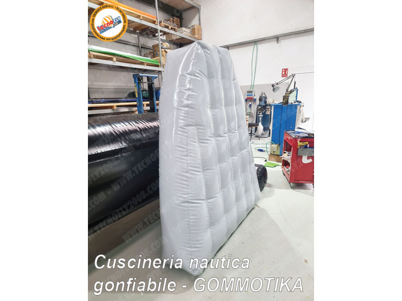 ingombranti materassini in gomma piuma per la vostra barca a vela o per il vostro gommone ? Avete mai immaginato di poter utilizzare un cuscino o un materasso gonfiabile realizzato ad hoc per gli interni di un natante? Certamente vi sarete accorti che i cuscini standard da nautica in gommapiuma, per quanto possono essere leggeri e confortevoli e perfettamente della sagoma richiesta, al momento dello stoccaggio diventano molto ingombranti, per non parlare della deformazione a cui vanno in contro se restano schiacciati sotto a qualche peso per troppi mesi (soprattutto durante il periodo in cui il natante è in rimessaggio). L'idea di poter sgonfiare il cuscino e ripiegarlo occupando un piccolo spazio, è certamente la soluzione al momento migliore, potendo contare su un materiale abbastanza resistente che non degeneri nel tempo in sgradevoli perdite d'aria. Ebbene si, cari visitatori del web, cari potenziali clienti amanti del mare e delle barche, oggi è possibile progettare e realizzare il vostro cuscino o il vostro materasso nella tipologia gonfiabile ad aria prigioniera (cioè senza il motore soffiatore, o comunemente chiamati anche ad aria ingabbiata, o in inglese Air Tight Inflatables). In questa sezione vengono mostrate diverse immagini di materassi e cuscini da barca realizzati su misura per completare l'arredamento di alcuni natanti. Si possono realizzare cuscini gonfiabili per completare il vano anteriore di un gommone, oppure di una piccola imbarcazione a vela nonchè per arredare l'interno di un camper o di un furgone. Non c'è limite alla fantasia, TecnoFly2008 Srl progetta e commercializza materassi gonfiabili di varie misure e forme. Questi gonfiabili ad aria prigioniera sono realizzati saldando ad alta frequenza dei pannelli di laminato di PVC bianco da 0,5 mm (Extra Strong PVC 670 gr/mq) o di altri spessori. Scendere sotto lo spessore di 0,5 mm certamente comporta un prezzo ridotto dell'oggetto, ma anche meno durevole e più soggetto a forature accidentali. Aria prigioniera, ovvero un gonfiabile che non necessita di alcun gonfiatore o motore soffiatore per restare in pressione; in pratica è come un canotto da mare, si gonfia ad aria con un semplicissimo gonfiatore elettrico o con una pompa a mano (comunemente reperibili sul mercato nei centri specializzati per campeggio, nautica e il fai da te). Per ottenere la forma di un materasso (o di un cuscino) è necessario prevedere all'interno del gonfiabile un certo numero di paratie ad aria comunicanti tra loro. Queste paratie fungono da centina e permettono di ottenere una forma più possibilmente squadrata, a seconda del numero di centine; più centine ci sono e minore è la curvatura del gonfiabile sulle pareti. Ogni paratia ha dei fori che mettono in comunicazione le varie celle per permettere all'aria di riempire tutti gli spazi facendo assumere al gonfiabile la forma voluta. La tecnica a paratia è largamente diffusa nella produzione di gonfiabili di medie e grandi dimensioni, soprattutto ove sono richieste delle forme squadrate. Molto diffusa anche la tecnica chiamata "trattenimento interno trapuntato", il quale si differenzia molto dal precedente a paratie poiché si ottiene una superficie bombata (come fosse una trapunta) grazie a molti ganci interni legati con cordicelle tra di loro. Un lavoro particolare, laborioso e dal risultato finale eccellente. Prima di saldare assieme i due laminati di PVC, vengono in pratica saldati dei punti di ancoraggio (sono degli ormeggi semplici da boa nautica) nelle parti interne del materasso; dei laccetti o cordini tutti rigorosamente della stessa distanza, vengono legati tra due punti di ancoraggio, e il risultato finale è esteticamente più bello. Un gonfiabile ad aria prigioniera quindi prevede una certa laboriosa fase di saldatura di tutti i settori che compongono le varie celle. Ovviamente il peso di una struttura tale è aggravata dal peso delle singole paratie interne. A seconda del tipo di utilizzo del gonfiabile viene scelto un materiale più o meno spesso, nelle immagini sotto mostrate è stato impiegato un laminato di PVC da 500 micron, cioè 0,5 mm di spessore, sufficientemente robusto e spesso per trattenere l'aria.